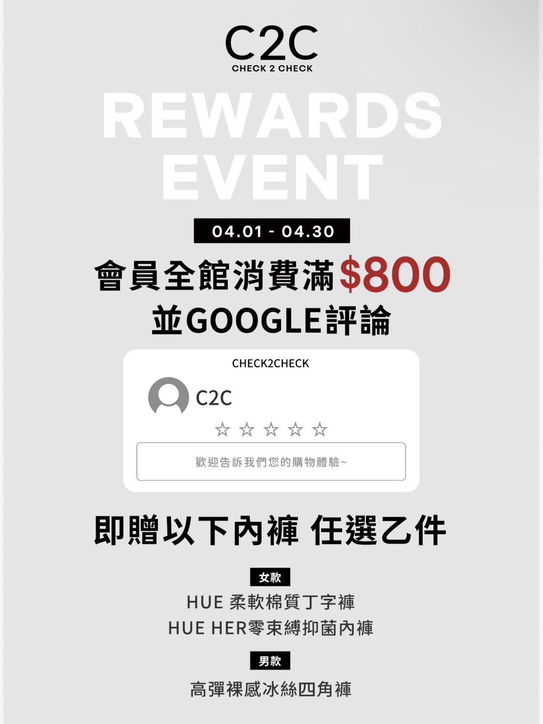 會員全館消費滿800元+google 評論即贈以下內褲任選乙件