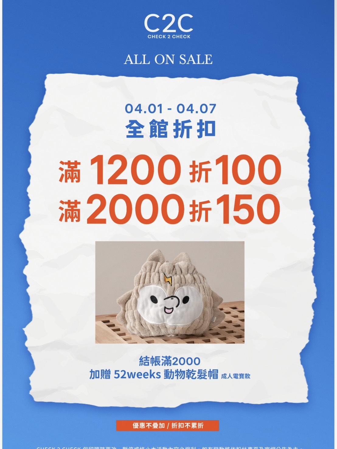 滿 2000 折150 加贈 52weeks 超吸人氣動物乾髮帽-限成人電寶